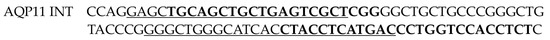 Nucleotide sequence of the partial spiny dogfish AQP11 148 bp fragment generated with the AQP11 sense and AQP11 antisense nucleotide-based degenerate PCR primers (see Table 2). The primer sequences themselves have been removed as they are unreliable. The 5′ RACE primers produced from this sequence are bolded, and the 3′ RACE primers are underlined.
