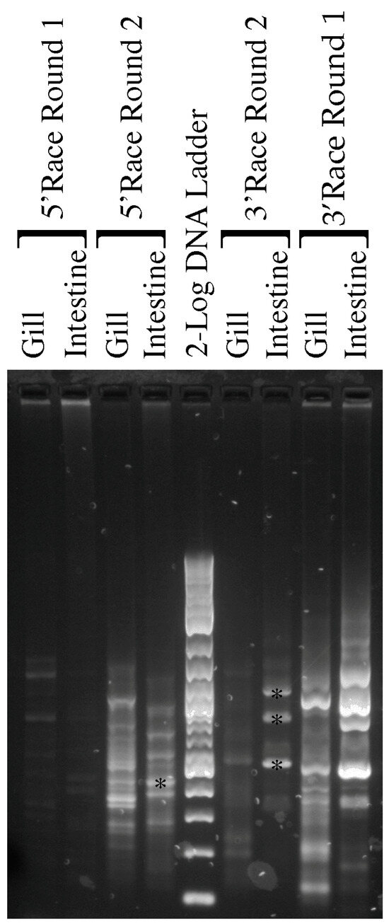 A 1.5% agarose gel of Nested 5’ and 3’ spiny dogfish AQP11 RACE products produced from gill and intestinal 3’ and 5’ RACE cDNA. The first round of nested PCR reactions is listed as Round 1. These Round 1 reactions were then used as the DNA templates for Round 2 nested PCR reactions.2-log DNA marker ladder (NEB) is shown as a size reference. Bands in intestinal cDNA Round 2 tracks marked with a * were excised, purified, cloned and sequenced.