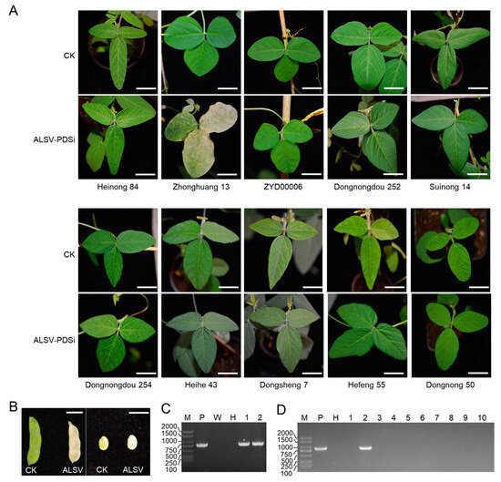 Phenotypes and RT–PCR analyses of ALSV-PDSi infectivity on different soybean varieties. (A) Symptoms of the systemic leaves of 10 soybean varieties inoculated by ALSV-PDSi at 20 dpi. Scale bars, 5 cm. (B) Phenotypes of bean pods (left) and seeds (right) produced by seedlings of Zhonghuang 13 inoculated by ALSV-PDSi (ALSV) or buffer (CK). Scale bars, 1 cm. (C) RT–PCR detection of ALSV genome in the seed coat and seed. Lanes M, P, W, and H indicate the DNA ladder, plasmid control, mock control, and healthy soybean seed control, respectively. Lanes 1 and 2 are seed coat and embryo showing photobleaching phenotype, respectively. (D) RT–PCR analysis of the presence of viral genome in the systemic leaves of the ten soybean cultivars. Lanes 1 to 10 are Heinong 84, Zhonghuang 13, ZYD00006, Dongnongdou 252, Suinong 14, Dongnongdou 254, Heihe 43, Dongsheng 7, Hefeng 55, and Dongnong 50, respectively.