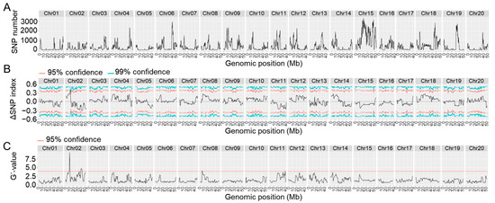 Distribution and visualization of SNPs. (A) Distribution of all SNPs on the twenty soybean chromosomes. (B) The ΔSNP index patterns of NGS-based BSA. (C) Pattern of the G′-value. The X-axis shows chromosome positions for all twenty chromosomes, while the Y-axis represents the count of SNPs (A), ΔSNP index (B), or G′-value (C). The ΔSNP index was computed as 1 Mb interval with a 10 kb stepwise. The red and cyan lines in panels (B,C) represent the expected values at 95% confidence (p < 0.05) and 99% confidence (p < 0.01), respectively.
