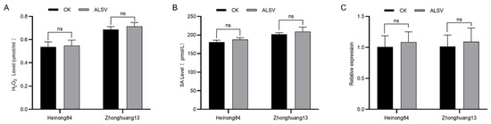 To test whether the dominant locus RALSV-L1 in Heinong 84 was associated with innate immunity, we compared the content of hydrogen peroxide (H2O2), a marker molecule of biotic stresses in plants. Thus, we inoculated seedlings of Heinong 84 and Zhonghuang 13 with ALSV or buffer and determined the content of H2O2 in the inoculated leaf tissue was at 48 h post-inoculation (hpi). The results showed that there was no significant difference in the contents of H2O2 in the leaves of Heinong 84 and Zhonghuang 13 inoculated by ALSV or buffer at 48 hpi (Figure 3A), indicating that the inoculation of ALSV does not induce the accumulation of H2O2 in Heinong 84 and Zhonghuang 13. We also compared the content of salicylic acid (SA), the key phytohormone of biotic stresses in plants, with the content of ALSV infection. The results showed that the SA content in Heinong 84 and Zhonghuang 13 was not significantly upregulated after the inoculation of ALSV at 48 hpi (Figure 3B). Finally, we directly compared the expression of pathogenesis-related genes 1 (PR1), the marker gene of plant innate immunity, in Heinong 84 and Zhonghuang 13. Quantitative PCR (qPCR) results showed that there was no significant difference in the expression of PR1 in the leaves of Heinong 84 and Zhonghuang 13 inoculated by ALSV or buffer at 48 hpi (Figure 3C). Together, we concluded that the resistance in Heinong 84 to ALSV is not controlled by innate immunity but instead may be controlled by non-immune-related mechanisms, e.g., RNA silencing, translation repression, essential host factors for virus proliferation, or atypical dominant viral resistance protein [25].