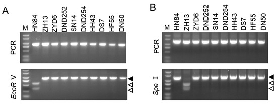 CAPS results of the eight soybean cultivars. (A,B) Gel electrophoresis results of the PCR products of primer pairs based on SNP4209 (A) and -SNP2130 (B) before and after restriction enzyme digestion. Lanes 1 to 10 represent Heinong 84 (HN84), Zhonghuang 13 (ZH13), ZYD00006 (ZYD6), Dongnongdou 252 (DND252), Suinong 14 (SN14), Dongnongdou 254 (DND254), Heihe 43 (HH43), Dongsheng 7 (DS7), Hefeng 55 (HF55), and Dongnong 50 (DN50), respectively. The PCR amplicons are indicated by solid arrowheads and digested fragments are indicated by hollow arrowheads.