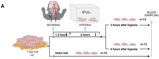 Pups were randomly divided into the following experimental groups: intact rats (n = 10), animals with HIE whose blood samples were taken 3 h after hypoxia (n = 13), and animals with HIE whose blood samples were taken 6 h after hypoxia (n = 12) (Figure 1A). Three and six hours after the hypoxic exposure, dry blood spots were obtained.