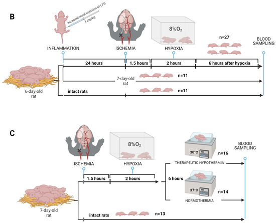 Study design: (A) HIE with sampling at different times; (B) HIE model supplemented with LPS-induced inflammation; (C) modeling of therapeutic hypothermia.