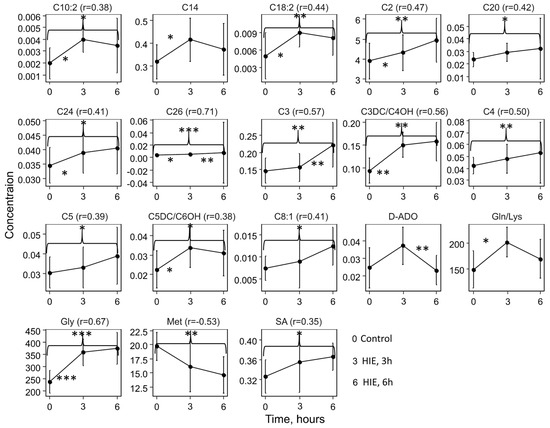 Line graphs representing the concentration levels of metabolites that show significant changes over time. Data are presented as mean ± SD. *—p < 0.05, **—p < 0.01, ***—p < 0.001—significance changes between neighbor timepoints or, in case of curly brackets between control (0) and HIE, 6 h (6) according to the Mann–Whitney test.