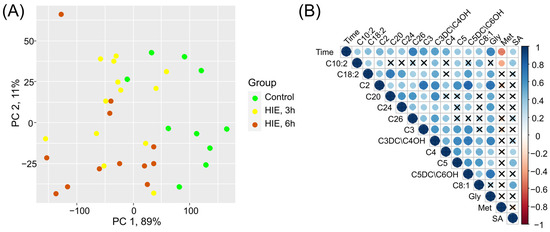 The impact of time after hypoxic–ischemic exposure on the low-molecular-weight spectrum of DBS: (A) Principal Component Analysis (PCA) space based on blood compounds, whose levels show statistically significant differences in pairwise group comparisons; (B) Correlation diagram of the compounds that show statistically significant associations with the time elapsed since the HIE. X is a label indicating the absence of a significant association.