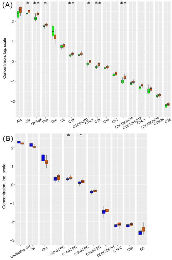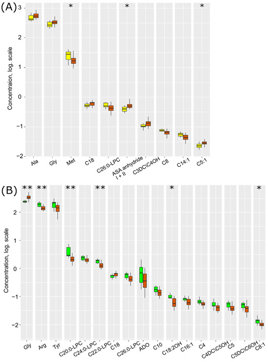 Box plots of DBS metabolites, statistically significantly differing (p < 0.05 according to the Mann–Whitney test) in comparisons between (A) LPS-induced inflammation (yellow) and inflammation associated with HIE (sienna) and (B) control (green) and inflammation associated with HIE (sienna). *—p < 0.01, **—p < 0.001 according to the Mann–Whitney test.