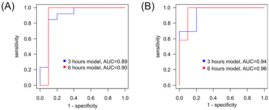 Receiver operating characteristic (ROC) curves for diagnosing after 3 h and 6 h post-HIE based on (A) logistic regression models, which utilize the concentration of glycine raised to the second power [Gly]2 as a variable, or (B) orthogonal partial least squares (OPLS) models.