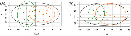 OPLS-DA scores plot for the diagnosis of hypoxia after (A) 3 h and (B) 6 h of exposure. The control group is indicated in green, and the group with hypoxic–ischemic injury is shown in orange.