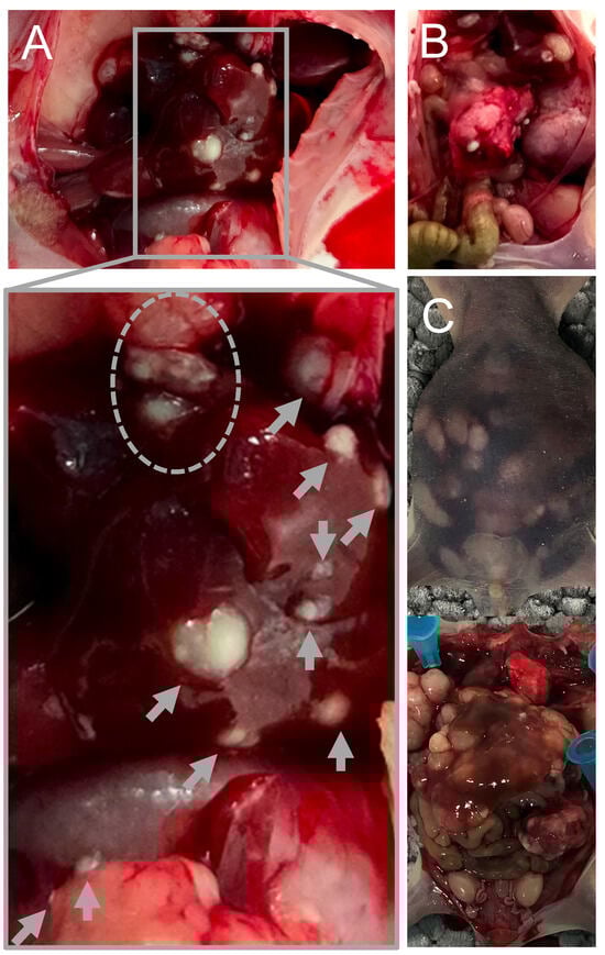 Representative images capturing metastases observed at the terminal stage in the preclinical xenograft mouse model. Panels (A–C) depict distinct individuals with visually identified metastases. Metastases in the liver is indicated by gray arrows.
