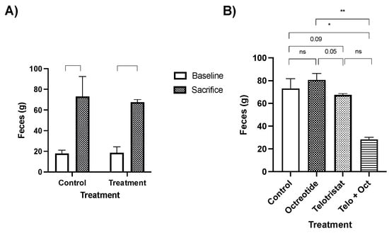 Changes in feces volume (in grams) at baseline and at the end of the study in the control group and the treated mice (A). Comparison of feces volume at the beginning and end of the study in the control group and the treated mice (treated with monthly octreotide, daily telotristat, or a combination of octreotide and telotristat). (B) Data represent the mean with standard deviation. Legend: *: p < 0.05; **: p < 0.01; ns: non-significant.