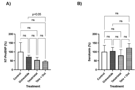 NT-ProBNP levels decreased in a non-significant, but clinically relevant, manner in the three drug-treated groups compared with the control group (Figure 5A). Specifically, NT-ProBNP decreased in the octreotide group by 28.2% (p = 0.49), in the telotristat group by 45.9% (p = 0.51), and in the combination group by 54.1% (p = 0.34) (Figure 4A). In contrast, plasma serotonin levels slightly decreased in a non-significant manner in the telotristat group compared with the control group (20.27%, p = 0.06) (Figure 4B). However, no decreases in serotonin levels were observed in the octreotide- or combination-treated groups (Figure 5B).