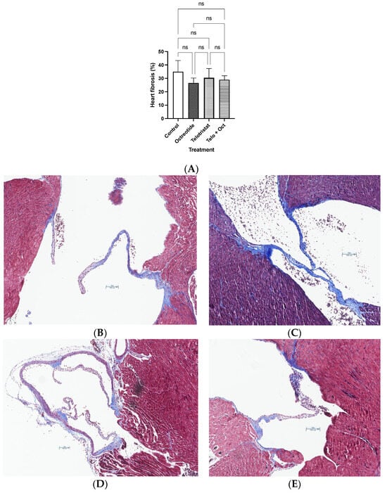(A) Heart fibrosis at sacrifice using Sirius red immunostaining. Data represent the mean with standard deviation. Representative images of valve fibrosis evaluated using histochemistry with Masson’s trichrome using a 10× scale in (B) the control group; (C) the octreotide group; (D) the telotristat group; (E) the combination group (telotristat and octreotide).