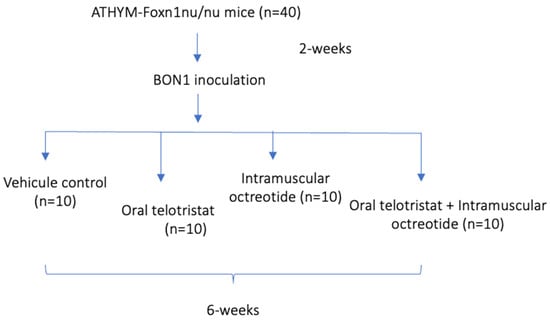 Then, a preclinical xenograft mouse model with inoculation of BON-1 cells in the spleen was developed following previously validated protocols []. Specifically, the 7-week-old ATHYM-Foxn1nu/nu mice (n = 40) were injected with 1 × 106 BON-1 cells [in 50 μL of PBS] into the spleen by splenectomy as previously reported []. BON1 is a pancreatic neuroendocrine cell line that secretes high levels of serotonin additionally with other hormones including neurotensin, pancreastatin and chromogranin A []. Briefly, mice were anesthetized with isoflurane and maintained under continuous flow in order to make a small left subcostal flank incision, and for the spleen exteriorization. Tumor cells were injected into the spleen using a 27-gauge needle. The spleen was returned to the abdomen, and the wound was closed in one layer with wound stitches. Painkillers were administered once after surgery. All animals were monitored after this procedure to ensure the individual well-being of each mouse.