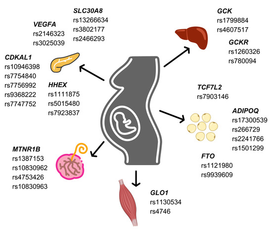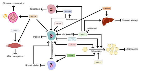 Effects of associated genes and SNPs in major tissues contribute to gestational diabetes mellitus. TCF7L2 promotes glucose storage in the liver, activates insulin secretion in β-cells by suppressing the expression of p85, and inhibits adipogenesis. The TCFL2 rs7903146 minor allele, T, downregulates the expression of TCF7L2. HHEX increases somatostatin secretion and adipocyte differentiation but inhibits the transdifferentiation of β-cells to δ-cells. SLC30A8 activates insulin secretion and reduces glucagon secretion. The SLC30A8 missense variant rs13266634 allele T improves glucose responsiveness and enhances proinsulin conversion. ADIPOQ activates adipogenesis. FTO inhibits insulin secretion and promotes adipocyte differentiation, and vice versa by CDKAL1. VEGFA maintains β-cell function. MTNR1B increases glucose consumption in the placenta and skeletal muscle, but decreases insulin secretion in pancreatic β-cells. GLO1 activates glucose uptake in skeletal muscle and GCK/GCKR promotes glucose storage in the liver. The transcription factor 7-like 2 (TCF7L2) gene, the haematopoietically expressed homeobox (HHEX) gene, the solute carrier family 30 member 8 gene (SLC30A8), the adiponectin, C1Q, and collagen domain containing (ADIPOQ) gene, the human fat mass and obesity-related (FTO) gene, the CDK5 regulatory subunit associated protein 1 like 1 (CDKAL1) gene, the vascular endothelial growth factor A (VEGFA) gene, the melatonin receptor 1B (MTNR1B) gene, the glyoxalase I (GLO1) gene, the glucokinase (GCK) gene, and the glucokinase regulator (GCKR) gene.