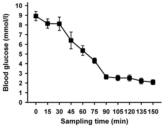Heart rate increased mildly from 104 ± 9 bpm at baseline to 113 ± 9 bpm during normoglycemia (which was preceded by surgical instrumentation) and moderately to 169 ± 22 bpm during the hypoglycemic period. Blood pressure increased slightly from 106/64 ± 5/5 mmHg to 114/73 ± 8/7 mmHg at the end of the hypoglycemic period. Body temperature decreased slightly from 37.8 ± 0.4 °C at baseline to 36.9 ± 0.3 °C at the end of the hypoglycemic period. Some information regarding the characteristics of the animals and basic vital parameters is provided in Table 1.