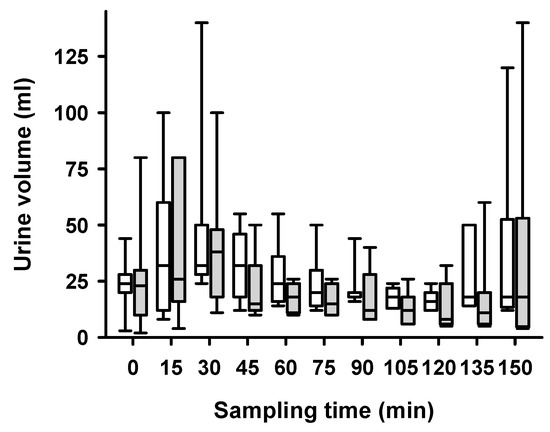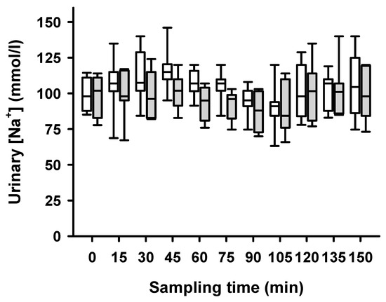 Urinary sodium concentrations after unilateral stimulation of renal nerves. Samples for sodium excretion measurements were taken every 15 min during high-volume-infusion-induced hyperperfusion of the kidneys in normoglycemia (0 to 75 min sampling time) and hypoglycemia (blood glucose below 3.5 mmol/L, 90 to 150 min sampling time). Decrease in urinary sodium [mmol/L] during the experiments in the non-stimulated (white boxes) and the stimulated (grey boxes) side (p < 0.0001). Data are presented as box plots, showing medians, 25/75th percentiles (boxes), and 10/90th percentiles (whiskers), n = 7.