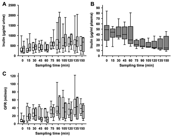 Inulin (A) in urine; (B) in plasma and glomerular filtration rate (GFR) (C) after unilateral stimulation of renal nerves. Samples for GFR measurements were taken every 15 min during high-volume-infusion-induced hyperperfusion of the kidneys during normoglycemia (0 to 75 min sampling time) and during hypoglycemia (blood glucose below 3.5 mmol/L, 90 to 150 min sampling time) was established. (A) Inulin [μg/mL] in urine during experiments duration in the non-stimulated (white boxes) and the stimulated (grey boxes) side (p = 0.23). (B) Plasma inulin concentrations in samples drawn from the carotid artery during the experiment are well below the saturation concentration for the tubular secretion system. (C) Decrease in GFR [mL/min] of the stimulated (grey boxes) side compared to the non-stimulated (white boxes) side (p = 0.0176) during LFS (not depicted). Data are presented as box plots, showing medians, 25/75th percentiles (boxes), and 10/90th percentiles (whiskers), n = 7.