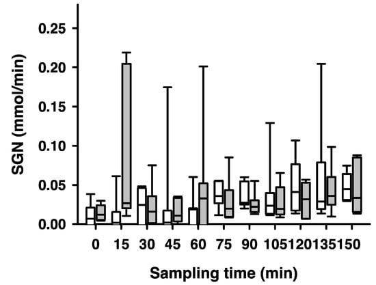 Side-dependent renal net glucose release (SGN) after unilateral stimulation of renal nerves. Samples for SGN measurements were taken every 15 min during high-volume-infusion-induced hyperperfusion of the kidneys during normoglycemia (0 to 75 min sampling time) and during hypoglycemia (blood glucose below 3.5 mmol/L, 90 to 150 min sampling time). White boxes represent SGN [mmol/min] of the non-stimulated kidney; grey boxes the stimulated kidney. No significant effect of SGN was observed in a linear mixed model (p = 0.11). Data are presented as box plots, showing medians, 25/75th percentiles (boxes), and 10/90th percentiles (whiskers), n = 7.