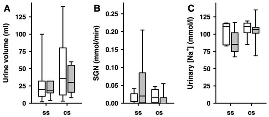 Side-dependent urine volume, SGN and urinary sodium concentration in a single unilateral stimulation of renal nerves. (A) Significant decrease in urine volume during normoglycemic LFS (first instance that LFS succeeded non-stimulation during normoglycemia) between the stimulated side (ss) and the contralateral side (cs) (Wilcoxon test; p = 0.0129). (B) The same experimental conditions as described above significantly increased SGN of the stimulated side (ss) compared to the contralateral side (cs) (Wilcoxon test; p = 0.03125). (C) The same experimental conditions as described above significantly increased urinary sodium of the stimulated side (ss) compared to the contralateral side (cs) (Wilcoxon test; p = 0.0017). Samples for measurements were taken over 15 min. Data are presented as box plots, showing medians, 25/75th percentiles (boxes), and 10/90th percentiles (whiskers), n = 7.