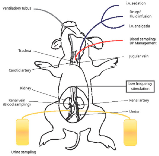 Immediately before the experiments commenced the animals underwent a four-hour food withdrawal, albeit with ad libitum access to water. The surgical procedure was performed under general anesthesia, in supine position and under strict sterile conditions. Anesthesia was induced by intramuscular injection of 15 mg/kg ketamine hydrochloride (Ketavet®, 100 mg/mL, Pharmacia Upjohn, Erlangen, Germany) and 0.2 mg/kg midazolam hydrochloride (Midazolam-ratiopharm®, Ulm, Germany). Thereafter, 0.2–0.3 mg/kg propofol (Disoprivan®, AstraZeneca, Wedel, Germany) was administered through a venous catheter in the ear vein (Vasocan®, Braun Melsungen, Melsungen, Germany), followed by orotracheal intubation (Trachealtubus, Rüsch, Kernen, Germany). Subsequent anesthetic maintenance was achieved through continuous inhalation of 1.5% isoflurane (Isofluran®, DeltaSelect, Dreieich, Germany) and O2; analgesia was maintained via the application of 0.003 mg/kg fentanyl per hour (0.05 mg/mL Fentanyl, Janssen). Dosages of up to 0.1 mg/kg pancuronium (Pancuronium-Actavis®, Actavis, München, Germany) were administered for muscular relaxation. Corneal moisture was ensured with the application of eye drops (Corneregel®, Bausch&Lomb, Berlin, Germany). To ensure a stable blood pressure during anesthesia, the animals received isotonic saline infusions (Isotonische Kochsalzlösung®, Fresenius, Bad Homburg, Germany). The carotid artery (Arteriofix®, Braun, Melsungen, Germany) and the jugular vein (Certofix Trio®, Braun, Melsungen, Germany) were catheterized for blood sampling and blood pressure measurement, as well as for intrapoperative administration of fluids and drugs. A midline laparotomy was performed to gain abdominal access, followed by an opening of the retroperitoneum. For urine sampling, size 6 charier catheters (Actreen® Glys Cath, Braun, Melsungen, Germany) were inserted into both ureters. Local blood sampling was facilitated via bilateral instrumentation of the renal veins with vascular catheters (Certofix® Trio, Braun, Melsungen, Germany), which were kept in position with Liquiband® Flow Control (Advanced Medical Solution, Devon, UK). To maintain body temperature, we used a water mat system (Hico-Variotherm 555®, REF 550025; PFM Medical Hico gmbh, Köln, Germany); additionally, the animals were covered with sheets where feasible. A simplified graphic representation of the surgical instrumentation is provided in Figure 8.