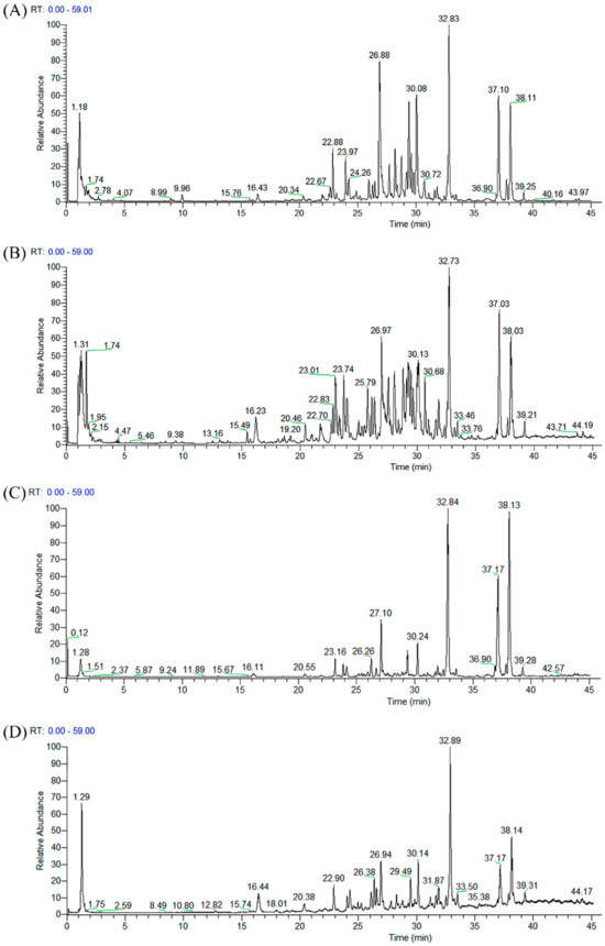 Chromatogram of huangqin water extract (WE) in positive (A) and negative (B) ionization modes, and huangqin ethanol extract (EE) in positive (C) and negative (D) ionization modes.