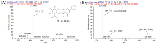 Peak #34 with a retention time of 28.22 min was selected as an example (Table 1 and Figure 2) for tentative structure identification in this study. The molecular ion detected in the positive ion mode ([M + H]+) is m/z 447.09207, which is consistent with C21H19O11 (mass accuracy, −0.263 ppm). And the molecular ion in the negative ion mode ([M – H]–) is m/z 445.07694, which is consistent with C21H17O11 (mass accuracy, 0.904 ppm). These results indicate that the molecular formula of peak #34 is C21H18O11. The major fragment ions detected in the positive mode are at m/z 429.0802 ([M + H–H2O]+), 285.0755 ([M + H–162]+), and 271.0599 ([M + H–glucuronide]+). The fragment ions of [M + H–162]+ are the result of a possible internal cleavage in the O-glucuronide group at its A ring. The major fragment ion detected in the negative mode is 269.0450 ([M – H–glucuronide]–). Based on these results and database information, this peak was tentatively identified as baicalin. Baicalin is a representative active flavone in huangqin, which has been proven to have antioxidant, antiviral, antitumor, and other biological effects [20,30,31,32,33].
