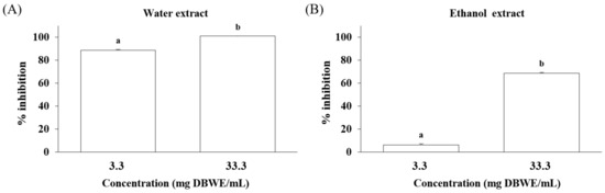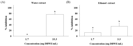 Inhibitory effects of the huangqin (A) water and (B) ethanol extracts on ACE2 activity. DBWE stands for dry botanical weight equivalents. Values are the mean ± SD of triplicate experiments. Letters a and b stand for significant differences (p < 0.05).