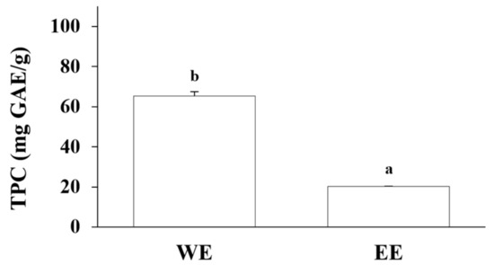 Total phenolic content (TPC) of the huangqin water (WE) and ethanol extracts (EE). Results are expressed as the mean ± SD of triplicate experiments and values are on a dry botanical weight basis. Letters a and b stand for significant differences (p < 0.05) between the water and ethanol extracts.
