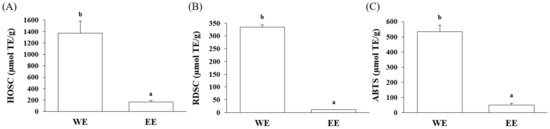 Relative free radical scavenging activities of the huangqin water (WE) and ethanol extracts (EE) against (A) HO●, (B) DPPH●, and (C) ABTS●+. Results are expressed as the mean ± SD of triplicate experiments and values are on a dry botanical weight basis. Letters a and b stand for significant differences (p < 0.05) between the water and ethanol extracts.