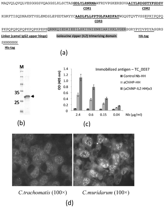 Characteristics of nanobody aChlNP recognizing Chlamydial Type III Secretion System Needle Protein. (a) Amino acid sequence of aChlNP. Complementarity-determining regions (CDRs, underlined and in bold) 1–3 are indicated. The linker sequence (underlined), isoleucine zipper (ILZ)-trimerizing domain (marked in gray) and tag sequences (HA-tag and His-tag, underlined) are added to the C-terminus of the initially selected sequence (VHH) to make its trimerizing modification, aChlNP-ILZ-HH. (b) Expression and purification of aChlNP-ILZ-HH verified using SDS-PAGE under reducing conditions (the arrow indicates the position of the protein monomer). (c) Reactivity of aChlNP in two formats and unrelated control nanobody in serial dilutions to plate-bind the TC_0037 protein of C. muridarum. OD values (y-axis) correspond to the amount of bound nanobodies and are shown as means of triplicates ± SD. (d) The trimerizing nanobody (aChlNP-ILZ-HH)x3 binds to C. trachomatis or C. muridarum, forming intracellular inclusions in infected eukaryotic McCoy cells. Images were observed at 100× magnification.
