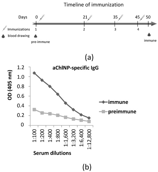 The immunization procedures, the cloning of the entire repertoire of variable domains of specific antibodies from the immunized camel lymphocytes and the subsequent selection of nanobodies were performed as described previously [34]. The camel immunization was performed according to a standard protocol, using a mixture of approximately 1 mg of aChlNP nanobody with an equal volume of LQ adjuvant (GERBU, Germany) for each step (Figure 2a). We observed using ELISA a marked increase in the antibody titer with a given specificity as a result of the immunization (Figure 2b). On the basis of the mRNA isolated from the peripheral blood lymphocytes of the immunized camel, using pairs of specially selected primers for PCR, we synthesized and cloned in a phagemid vector (pHEN4) the whole repertoire of cDNAs encoding the variable antigen-recognizing regions (“single-domain antibodies”) of the camel-specific antibodies, consisting only of a dimer of shortened heavy chains. From the obtained cDNA library, we performed functional selection using modified phage display of the single-domain antibody clones that specifically bind to the antigen-recognizing site (idiotype) of the aChlNP nanobody but do not bind to the constant sites of these nanobodies (we used other nanobodies available in our lab of the same general framework structure, but with a different recognition specificity, for negative and competitive selection). As a result of the selection procedures, we were able to obtain four different variants of new single-domain antibodies specifically recognizing the aChlNP nanobody idiotype (anti-idiotypic nanobodies, ai-Nbs, aiChlNP).