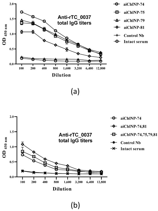 Next, we analyzed the combined effects of ai-Nbs in three-stage immunizations of mice. Since we do not yet know the features of either the dynamic nature of the recognizable epitope or the characteristics (for example, the degree of stabilization of the paratope loops) of specific selected ai-Nbs, one could assume the possibility of a synergistic effect of using a combination of the obtained ai-Nbs to induce in the host body the generation of corresponding antibodies with slight variations in their paptopes, which theoretically could collectively improve their binding to the target pathogenic epitope. This work did not reveal a significant synergistic effect. We reduced the scheme of ai-Nbs administration, as we had used several ai-Nbs at once, and compared that with only aiChlNP-74, which showed the highest titers of IgG antibodies specific to the rTC_0037 protein according to the ELISA data (Figure 4a). Sera from intact mice were used as the controls. Immunization with ai-Nbs in combination (aiChlNP-74 and -81; and aiChlNP-74, -75, -79 and -81) induced the production of TC_0037-specific antibodies at a titer of 1:12,800, while the difference in titers compared to the sera obtained via immunization with aiChlNP-74 alone was insignificant, which once again confirms the high immunogenicity of aiChlN-74 (Figure 4b).