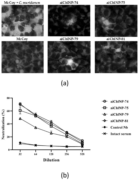 Evaluation of the neutralizing activity of the obtained serum antibodies in response to ai-Nb (aiChlNP-74, -75, -79 and -81) immunization. (a) The percentage of neutralizing activity of antibodies against C. muridarum infection in the McCoy cell line was evaluated. Images were observed at 100× magnification. (b) The number of chlamydial inclusions was counted 48 h after cells were infected with 1.4 × 105 IFU/mL C. muridarum culture with pre-immune and immune sera. Anti-control Nb immune and intact sera were negative controls. Neutralizing activity was determined by measuring the reduction in the number of inclusions formed by antibody-opsonized elementary cells. Graphs represent the percentage of neutralization as the mean of experiments performed with three repetitions, with standard deviations (p < 0.01).