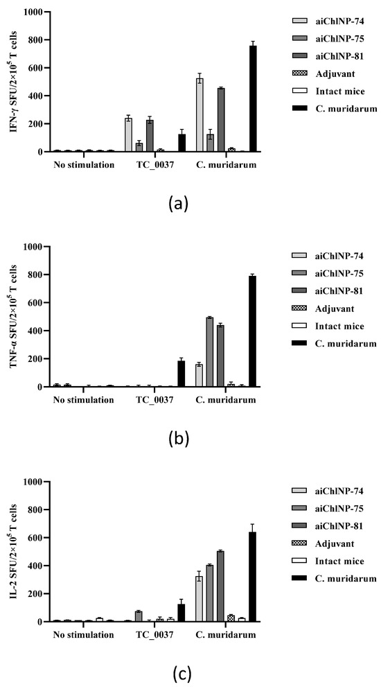 Since IFN-γ has been found to play an important role in mediating control over chlamydial infection, we evaluated the IFN-γ production by the T-cells in response to UV-killed C. muridarum and the rTC_0037 protein in ai-Nb-immunized mice. The T-cell responses specific to TC_0037 and C. muridarum were evaluated using ELISPOT two weeks after the last immunization. As shown in Figure 7, stimulation of the UV-killed C. muridarum and rTC_0037 induced strong IFN-γ production by the T-cells derived from the mice immunized with the aiChlNP-74 and aiChlNP-81 nanobodies. The IFN-γ induction in response to immunization with aiChlNP-75 was lower relative to with the aiChlNP-74 and -81 nanobody series but was significantly higher than the level of IFN-γ induction in the mice immunized with an adjuvant alone and the negative control (intact mice). It is worth noting that the production of a specific IFN-γ T-cell response during immunization with aiChlNP-74 and aiChlNP-81 in response to the stimulation of the splenocytes with rTC_0037 was higher in comparison with the group of mice infected with C. muridarum, indicating the high specificity of the obtained antibodies. Interestingly, when the splenocytes were stimulated with the UV-inactivated C. muridarum, the IFN-γ production in response to immunization with aiChlNP-74 and aiChlNP -81 correlated with the response in the mice infected with C. muridarum (natural infection), suggesting that these nanobodies may have some therapeutic activity (Figure 7a).