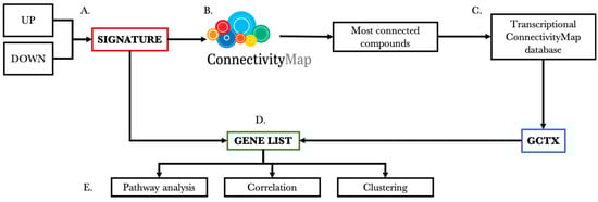 Briefly, the first step (A) consists of extracting a gene signature for each dataset of interest using up- and down-regulated differentially expressed genes. In step B, the signatures are loaded on the clue.io platform, which provides functions for signature–signature comparison using the Connectivity Map database. Given the interest in the transcriptional effects of drugs, the analysis is restricted to the compounds only. In step C, four identifiers (pert_id, pert_iname, cell_id, and gene_info) are used to extract genes and their expression values, expressed as z-score, from the CMap database in gctx format. Genes with their expression values are then compared with each signature from step A to identify common genes with the same direction of transcriptional regulation to obtain a gene list (step D). Finally (step E), the extracted gene lists are evaluated through pathway analysis, to identify their associated relevant pathways and are further investigated with correlation and clustering analysis to identify similarities between drugs. The following sections show in detail the results obtained from each step of the defined workflow when applied to the considered case of trabectedin.