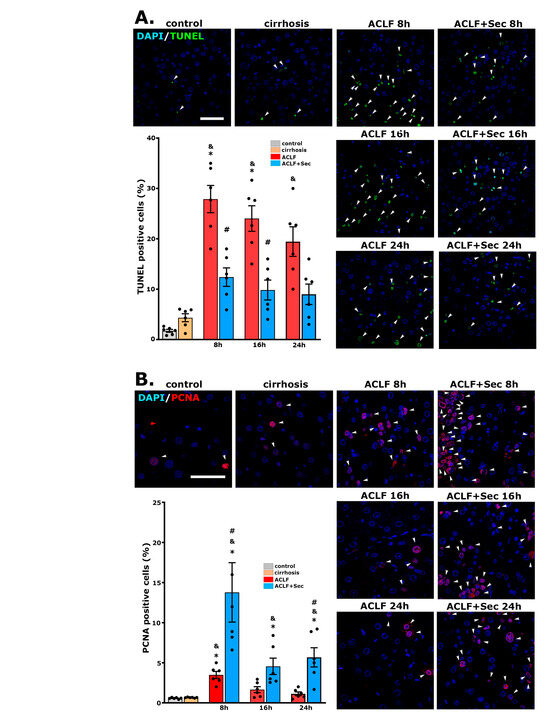 As previously indicated, the chronic hepatic condition (cirrhosis) renders hepatocytes particularly vulnerable to injuries, which is associated with the inhibition of the endogenous regenerative capacity [11,12]. Since hepatocyte death occurs if cells cannot complete the mitotic cycle, the TUNEL assay was employed to investigate whether apoptosis contributed to the failure in liver regeneration in ACLF animals. As illustrated in Figure 2A, the TUNEL assay revealed scarce apoptotic cells in the control group, while animals in the cirrhosis group did not exhibit a significant increase. However, the rats in the ACLF groups displayed an elevated apoptotic rate between 8 and 24 h after acute failure initiation. Conversely, a significant reduction in TUNEL (+) nuclei was observed in the livers of MSC-secretome-treated animals (Figure 2A).