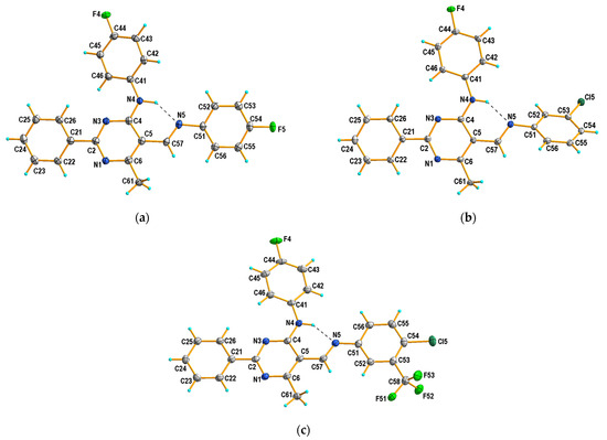 On the whole, the molecule adopts the trans (E) configuration around the imine functional group in all cases. The pyrimidine ring is planar, and the phenyl group at the 2-position is almost coplanar with the plane of this ring in 4b–4d, or only slightly twisted regarding the plane of the ring in 4a, as also observed in the recently described Schiff base structure (III) [43]. Compounds 4a and III differ only in their aromatic ring substituent (compound 4a with F and compound III with OC2H5 [43]), which is probably the cause of their similar conformation. It should be noted that, in the structure of 4b, the aryl substituent in the 5-position is the most twisted relative to the pyrimidine ring plane, by almost 42°. In the other cases, the conformation is almost syn-planar, with the greatest interplanar angle distortions involving the aryl substituent at the 5-position in the 5 to 15° range. Simultaneously, in the case of 4b, the aryl substituent in the 4-position is the most coplanar with the pyrimidine ring plane compared to other tested compounds (Table 2).