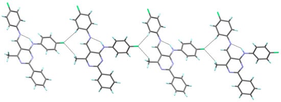 The molecular packing in the crystalline state for compound 4a is mainly determined by the intermolecular C–H∙∙∙F, which engages the fluorine atom of the (4-fluorophenyl)amino group as a double acceptor, and the H atoms of the aryl substituent at the 5-position and the methyl group, respectively. In this way, a one-dimensional hydrogen-bonded chain is formed (Figure 3). It is noteworthy that the fluorine atom of the aryl substituent in the 5-position does not participate in the formation of C–H∙∙∙F interactions, which results from the fact that the calculated H∙∙∙F distances are longer than the sum of H and F van der Waals radii [45].