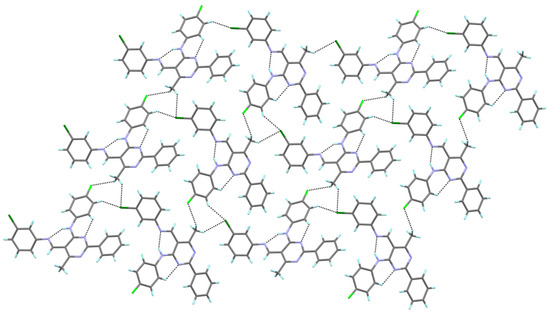 In the crystal structure of 4b, two types of intermolecular hydrogen bonds are recognized. The molecules of 4b are linked by intermolecular C–H∙∙∙F interactions, which lead to the formation of a chain. The fluorine atom of the (4-fluorophenyl)amino group forms a hydrogen bond (as an acceptor) with the methyl group at the 6-position of the pyrimidine ring (as a donor). Such chains interact further via C–H∙∙∙Cl hydrogen bonds to form a layered structure, with the chlorine atom of the 3-chlorophenyl group acts as a double acceptor in these interactions (Figure 4).