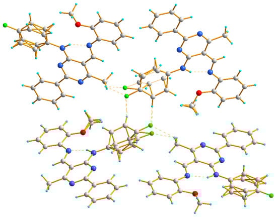 The crystal structure of 4c displays a hydrogen-bonded arrangement which is dominated by C–H∙∙∙F hydrogen bonds (Figure 5). Interestingly, even though compounds 4c and III [43] contain an alkoxy group at the aromatic ring (compound 4c with OCH3 (ortho) and compound III with OC2H5 (para) [43]), the crystal structure of III contains intermolecular C–H∙∙∙O interactions, while the structure of 4c does not. The molecules denoted as B(D) of compound 4c are connected by intermolecular C–H∙∙∙F interactions, which leads to the formation of a dimer in which (4-fluorophenyl)amine groups act as donors and acceptors. The molecules denoted as A are connected to such dimers through other intermolecular C–H∙∙∙F con-tacts mainly involving methyl groups (Table 3, Figure 5).