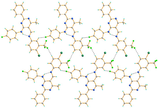 In the crystal structure of 4d, two chains are formed, both due to hydrogen bonding of the C–H∙∙∙F type. Similar to other studied compounds, in each of these chains, the fluorine atom of a (4-fluorophenyl)amino group serves as an acceptor of the aryl H atom. On the other hand, the fluorine atom of a -CF3 group acts as an acceptor to the aryl H atoms at the 5-positon, resulting in a ribbon of molecules (Figure 6).