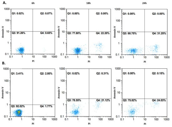 To confirm the cell death pathway, another approach to flow cytometry was used. Cells, after 6, 18, and 24 h incubation with compound 4b at IC50, were stained with propidium iodide (PI) as in the previous experiment, but also with annexin V. One of the main characteristics of apoptotic cells is the phosphatidylserine (PS) residues’ translocation from the inner to the outer membrane of the cytoplasmic membrane. Annexin V is a specific PS-binding protein, and thus it is used to detect apoptotic cells. The results are presented in Figure 9. Very few events could be observed in the first and the second quadrant, which represent apoptotic cells. Most events occurred in the third and the fourth quadrant, where unstained and necrotic cells were located. The 24 h measurements after both flow cytometry approaches were consistent with each other. Thus, it can be concluded that compound 4b activity leads to irreversible cell injury and necrosis in both tested cell lines.