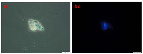 In order to obtain information about cells and nuclei morphology, fluorescence microscopy was used. Briefly, after the incubation of A172 and AGS with compound 4b (at three time periods, namely 24, 48, and 72 h) cells were stained with Hoechst 33342 dye, which binds to DNA. Phase-contrast observations were also performed. The results are presented in Figure 10. The nuclei of healthy proliferating cells should be spherical, with DNA evenly distributed in it, as can be seen in A1,2 (A172) and B1,2 (AGS), which depict control cells incubated with 1% DMSO for 72 h. Also, the cell membrane should be intact with a visible halo around the cells. In necrotic cells, the nuclei edges tend to be less clearly defined, and Hoechst 33342 results in a decreased fluorescence signal. This effect can be seen in a1,2 (A172) and b1,2 (AGS). Overall, the microscopic observations confirmed the results obtained during flow cytometry, that the compound 4b leads to necrosis in the observed cell lines.