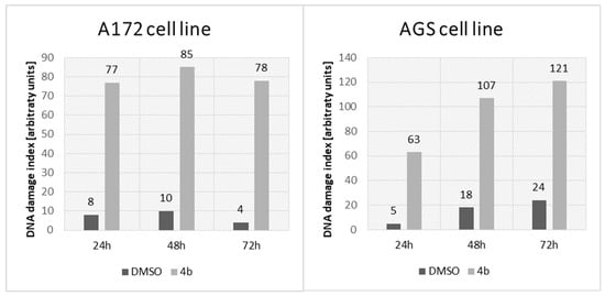 DNA damage index (after comet assay) in A172 and AGS cell lines from the control (incubated with 1% DMSO) and treated (incubated with compound 4b at IC50) groups after three incubation periods (24, 48, and 72 h).