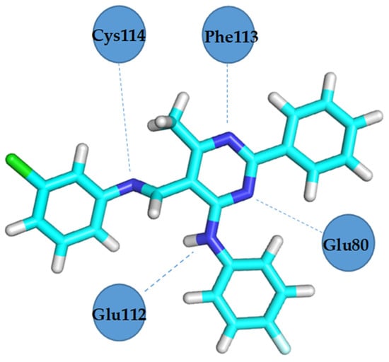 Docking studies revealed that compound 4b showed better binding affinity to VEGFR2 (−8.2 kcal/mol) than Schiff base III [43] (−6.8 kcal/mol) in their best ranked conformation. In-depth analysis revealed that compound 4b formed hydrogen bonds with Cys114, Phe113, Glu80, and Glu112 of VEGFR2, while recently reported compound III [43] formed hydrogen bonds with the same residues and additionally with Asp191 of VEGFR2. Due to the presented possible mode of action, compound 4b may be a valuable drug candidate.