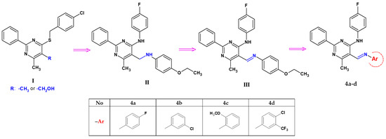 Based on the above information and considering the need to discover and develop biological active agents, we synthesized new 6-methyl-2-phenylpyrimidin-4-amine derivatives by a structural modification of the 5-[(4-ethoxyanilino)methyl]-N-(4-fluorophenyl)-6-methyl-2-phenylpyrimidin-4-amine molecule (III) [43], its structure constituting a valuable core for further optimization. The structural elements of this molecule were exchanged in the following directions and only in the 5-position of the pyrimidine ring: a change of an amino group into an imine moiety in the functional group, a change of the substituent and/or the introduction of an additional substituent with different electro-/nucleophilic properties to the aryl ring connected to the imine group (Scheme 1). The structures of the obtained compounds, four novel pyrimidine Schiff bases, 5-iminomethyl-6-methyl-2-phenylpyrimidine derivatives (denoted as 4a–d), bearing potentially biologically active functionalities, were established by spectroscopy techniques and studied for their cytotoxic activity in vitro towards normal (RPTEC) and cancer (AGS, HeLa, HepG2, A172, Ca-co-2) cell lines. In order to expand current knowledge about the features responsible for the biological activity of the new 5-iminomethylpyrimidine derivatives, X-ray single-crystal and ADME prediction analyses were carried out, and their results are presented here.