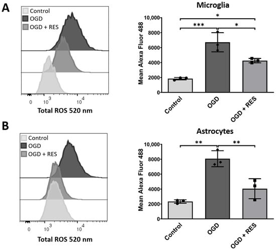 Production of reactive oxygen species increases during OGD. (A,B) Representative histograms of staining for total ROS in unstimulated, 24 h OGD-activated, and OGD-activated and resveratrol-treated glial cells. Mean fluorescence intensity measured using flow cytometry reveals higher intensity for samples after 4 h OGD treatment in ROS-labeled (A) microglia and (B) astrocytes. Cells were co-treated or untreated with 100 µM resveratrol (RES) and compared to untreated control. n = 3, number of independent cell cultures, indicated by separate dots (normoxic, without resveratrol), rhombs (OGD without resveratrol) and squares (OGD plus resveratrol); * p < 0.05, ** p < 0.01, and *** p < 0.001.