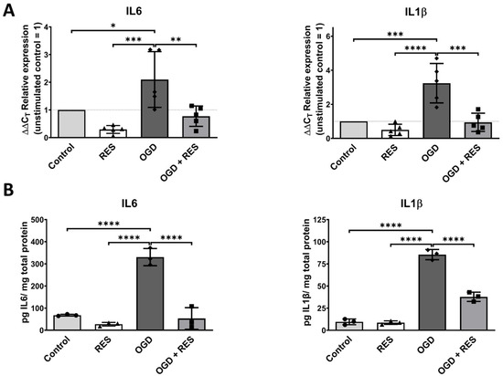 To further test the OGD-induced microglial cell response, the mRNA and protein expression levels of the proinflammatory cytokines IL6 and IL1β were analyzed after 24 h of OGD exposure (Figure 2A,B). Cytokines play a key role in inflammatory processes and are released by the microglia after injuries [32]. Again, resveratrol (100 µM) was added to validate its effect on OGD-mediated inflammation. Quantitative polymerase chain reaction (qPCR) showed a significant increase in the mRNA production of both cytokines in the cells cultured under OGD conditions compared to the controls (IL6 p = 0.0251; IL1β p = 0.0003). These findings were confirmed at the protein level using an enzyme-linked immunosorbent assay (ELISA), where higher cytokine concentrations after OGD treatment in the cell supernatants for IL6 (p < 0.0001) and IL1β (p < 0.0001) were observed. In contrast, the OGD-triggered production of cytokines could be drastically reduced at the mRNA level (IL6 p = 0.0066; IL1β p = 0.0003) and protein level (IL6 p < 0.0001; IL1β p < 0.0001) in the samples supplemented with resveratrol.