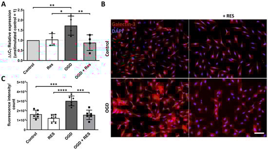 Subsequently, the changes in the astrocytes after 24 h of OGD were investigated. Hence, qPCR (Figure 3A) and fluorescence immunocytochemistry (ICC) (Figure 3B,C) were conducted to evaluate the galectin-3 expression levels. Galectin-3 is a lectin that is involved in diverse cellular processes including cell–cell and cell–matrix interactions, as well as proliferation/apoptosis control. In the brain, the galectin-3 expression is increased in reactive astrocytes [33,34]. The results showed a significant increase in the mRNA levels of galectin-3 (LGALS3) in the cells incubated for 24 h under OGD conditions compared to the controls (p = 0.0047), and these effects were even more pronounced at the protein level, which was assessed via the quantification of the fluorescence signal intensity of the galectin-3 ICC (p = 0.0002). Treatment with 100 µM of resveratrol reduced the OGD-induced effects on the mRNA and protein expression, making it comparable to that in the control cells under the standard culture conditions (Figure 3A–C).